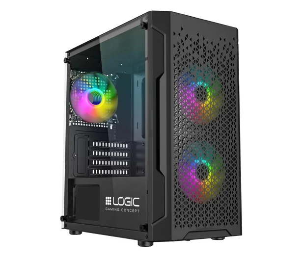 Logic Aramis Mini ARGB to kompaktowa obudowa mATX, która łączy niewielkie wymiary z gamingowym stylem. Posiada panel boczny z hartowanego szkła i wentylatory z ARGB, które nadają zestawowi efektowne podświetlenie. Jej wymiary to około 375 × 200 × 405 mm, dzięki czemu dobrze sprawdzi się na biurku lub w mniejszej przestrzeni. To propozycja dla graczy szukających zgrabnej i stylowej konstrukcji.